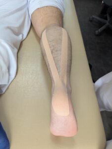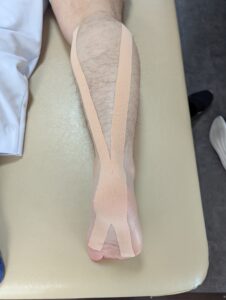 ふくらはぎの痛みなのに足の裏の方にまでテーピングが伸びているのがわかると思います。